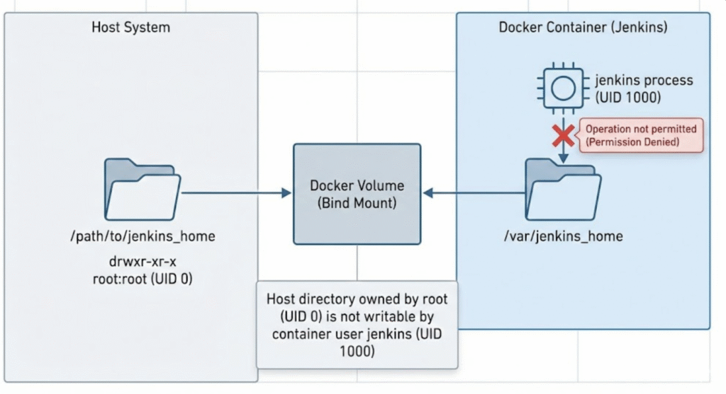 jenkins사용자(UID 1000)가 호스트의root사용자(UID 0) 소유인 디렉토리에 쓰기 작업을 시도하게 됩니다. 리눅스 커널은 이를 보안 위반으로 간주하고 접근을 차단하여 “Operation not permitted” 권한 오류를 발생시키는 것입니다.